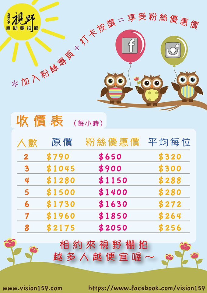 A : 視野自助棚拍館以人頭計算,所以越多人越便宜喔.另外~視野自助棚拍館不定時會有優惠,所以請關注粉專以得到最新訊息喔!